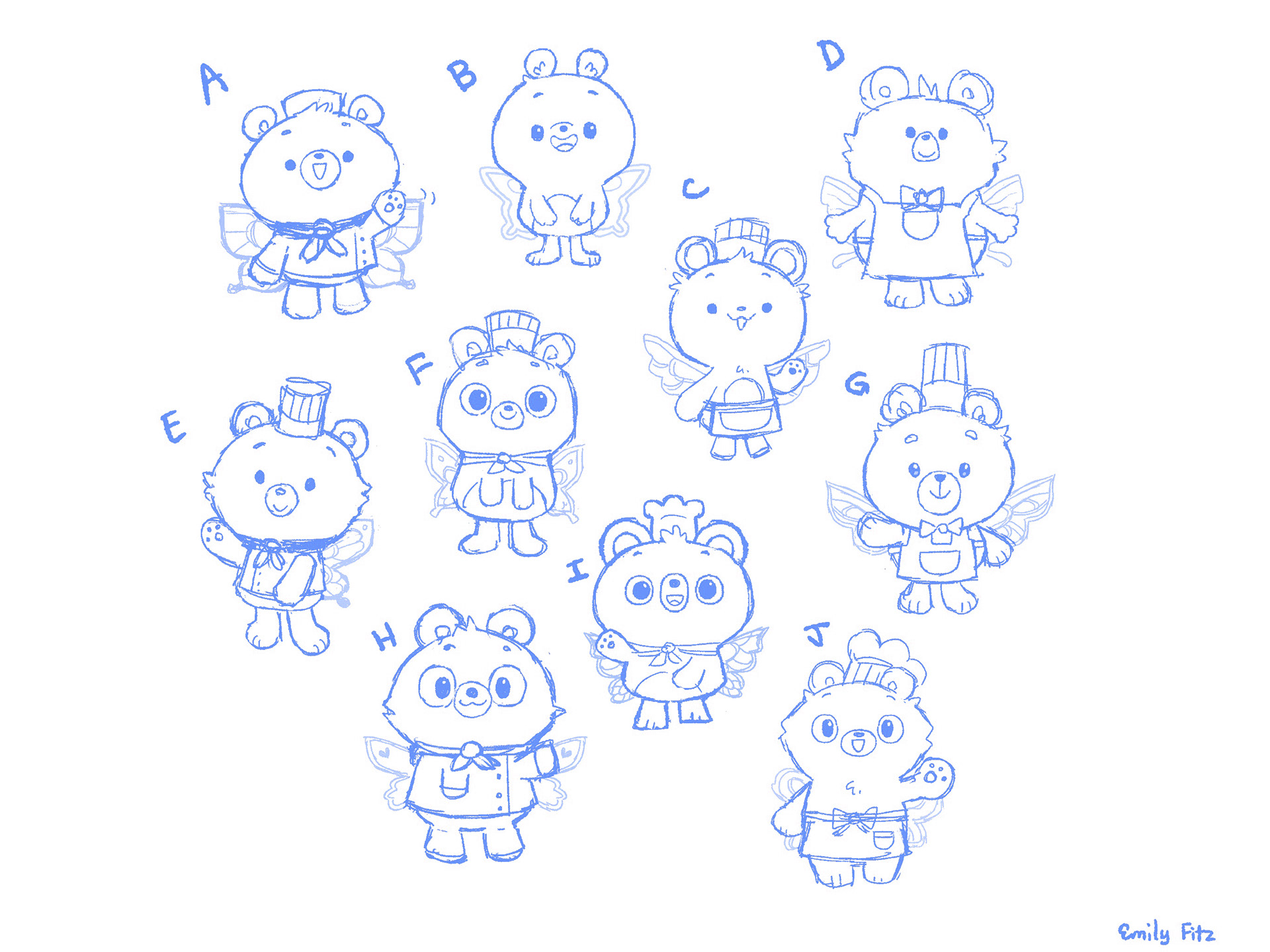 Development sketches for a character described as a fairy bear who wants to be a chef